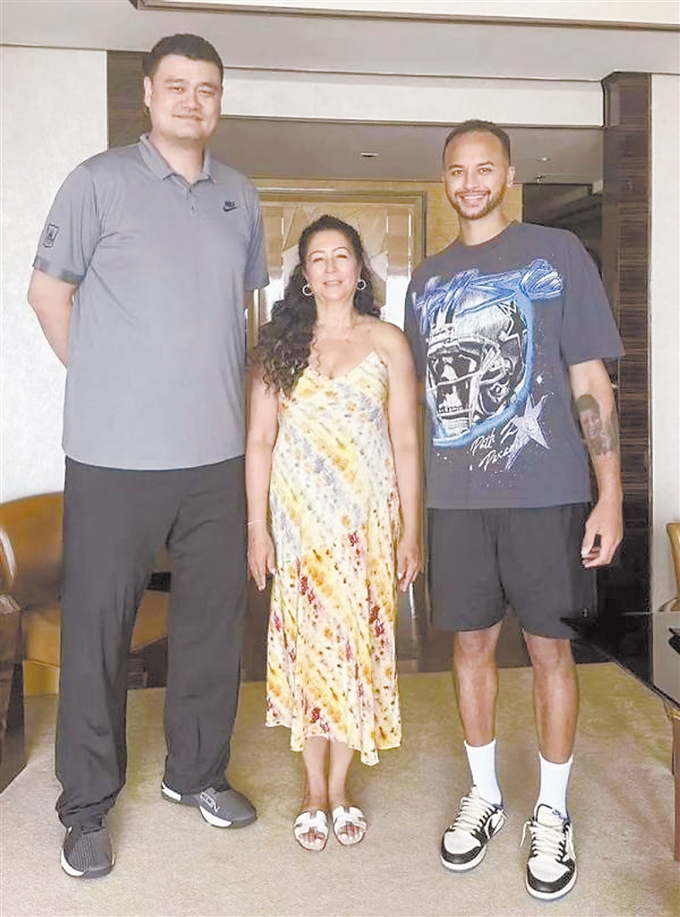中国篮协主席姚明与李凯尔(右)及其母亲合影。 据中国篮协