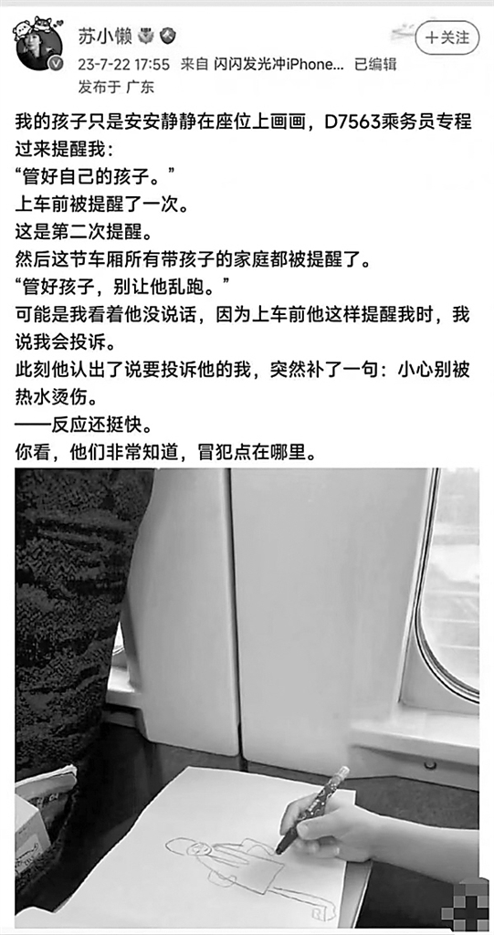 7月25日,苏小懒告诉记者,当天她还未走进车厢,还站在车厢外,乘务员便提醒她管好孩子,不要乱跑,不要打扰到别人。