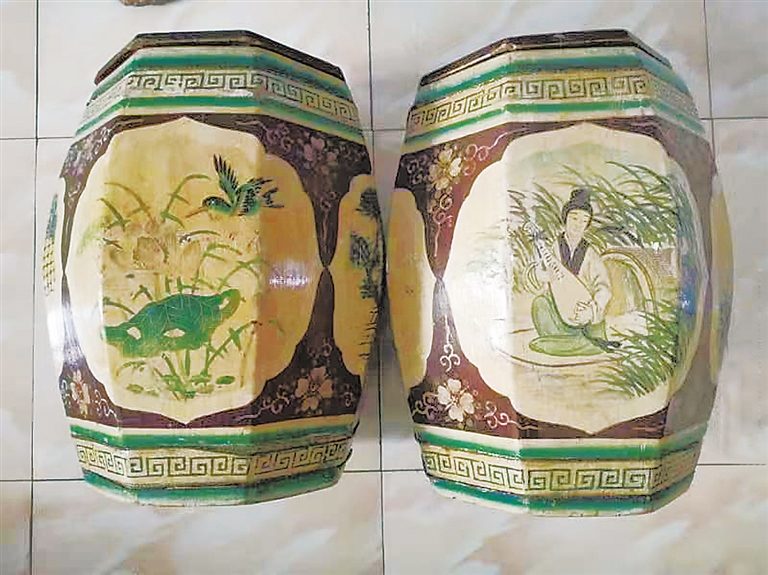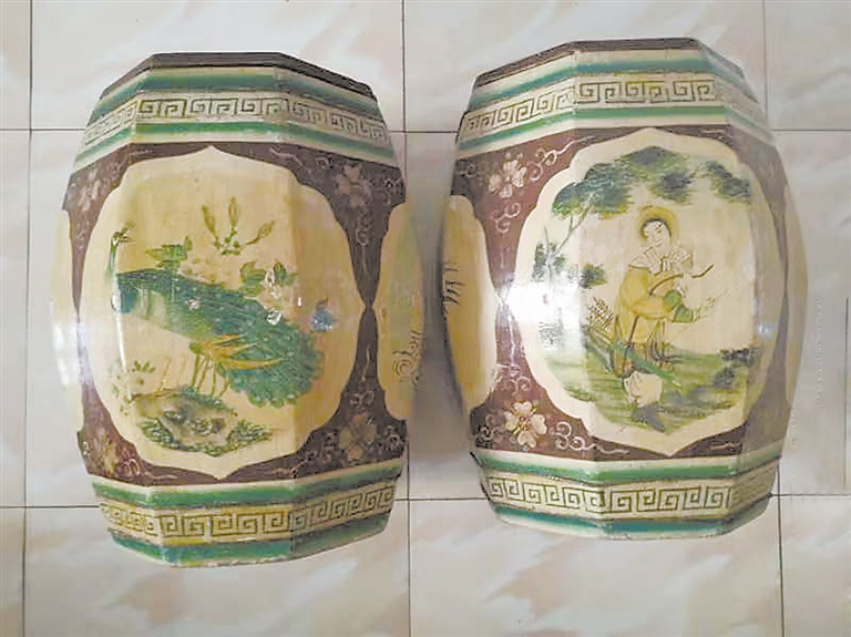 这绣墩呈八角鼓形,四开光,一对也即八个画面。器物“开光”是一种极好的装饰方法,框内多绘人物、山水、花鸟等,像一幅幅的连环画,既突出了所要表现的主题,又调剂盘活了整体画面,可谓一举两得。