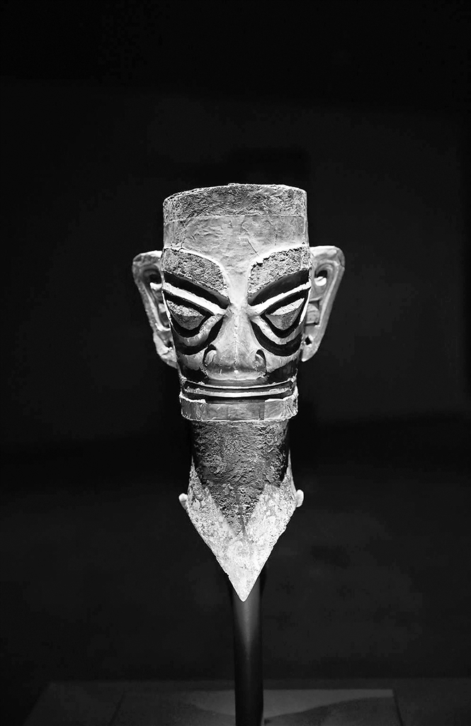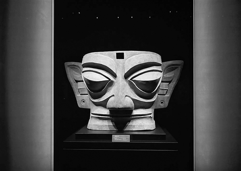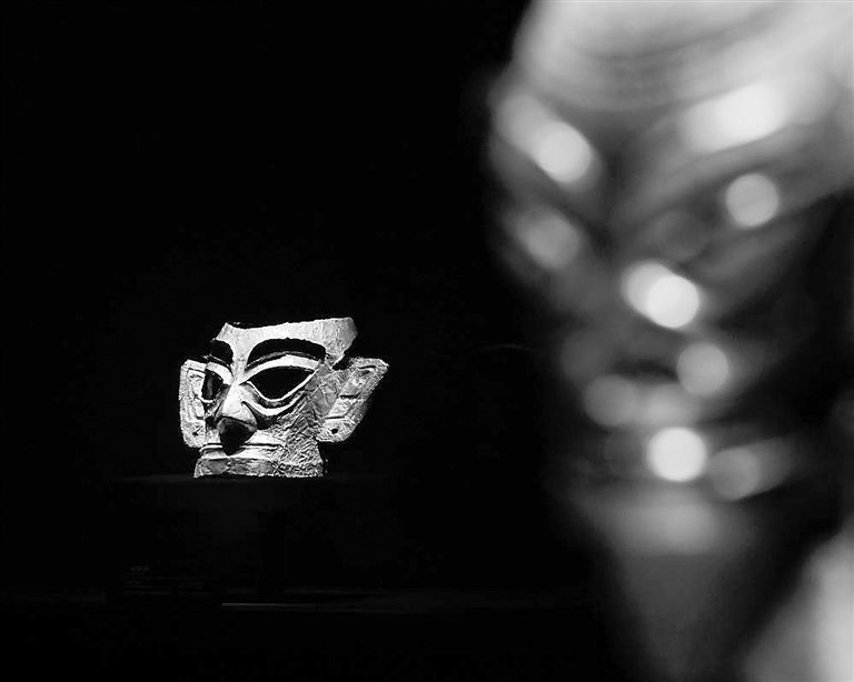青铜神兽。 新华社记者 刘坤 摄 戴金面罩 青铜人头像。 新华社记者 刘坤 摄