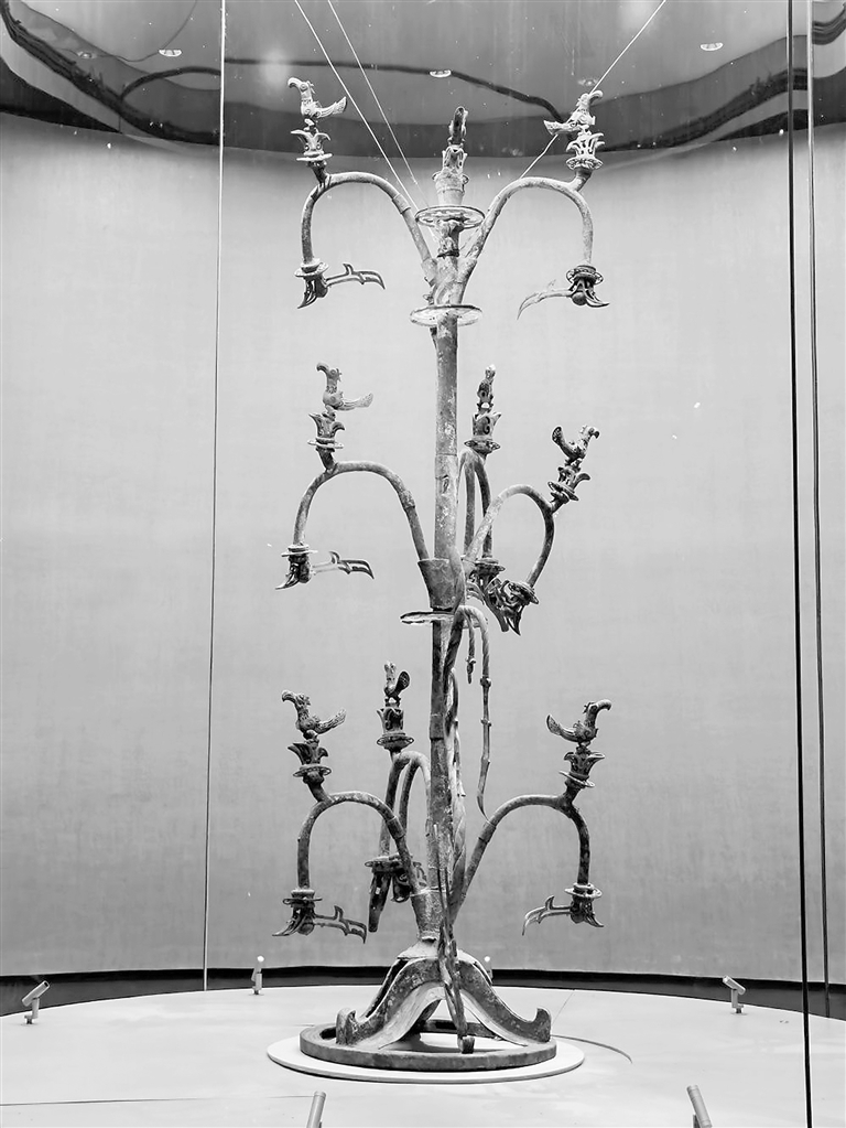 近4米高的青铜神树是三星堆的“镇馆之宝”,也是新馆的“压轴之作”。在专门为“通天神树”辟出的展陈空间内,1号青铜神树居于中央。尽管树顶残缺,但其高度仍然需要观众仰视。树分三层,每层三枝,枝上生出花朵、缀着果实,站着头顶羽冠的立鸟,一条神龙缘树而下,前足踏于神树的山形底座盘上。周围展柜里,环绕着2号青铜神树的“枝丫”,凸显青铜神树大、精、奇、美,3000年前的铸造工艺之高超一目了然。