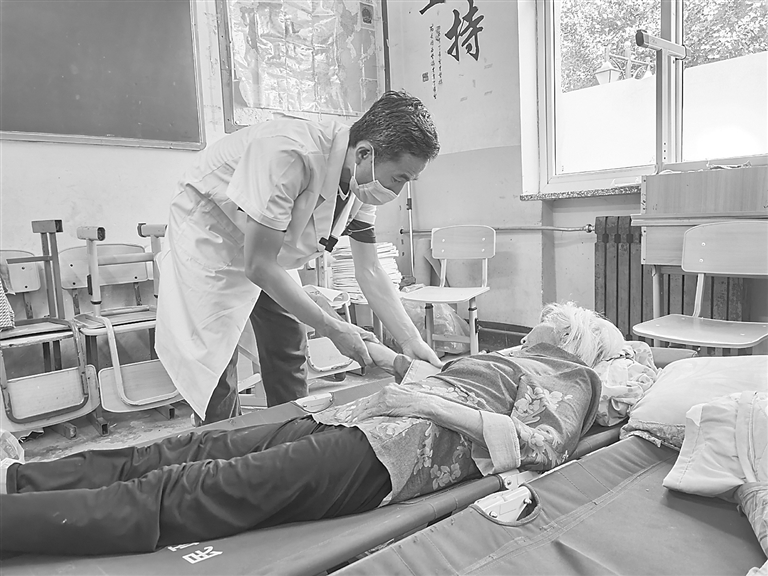 高庆武为安置点老人看病。 霍若雯 摄