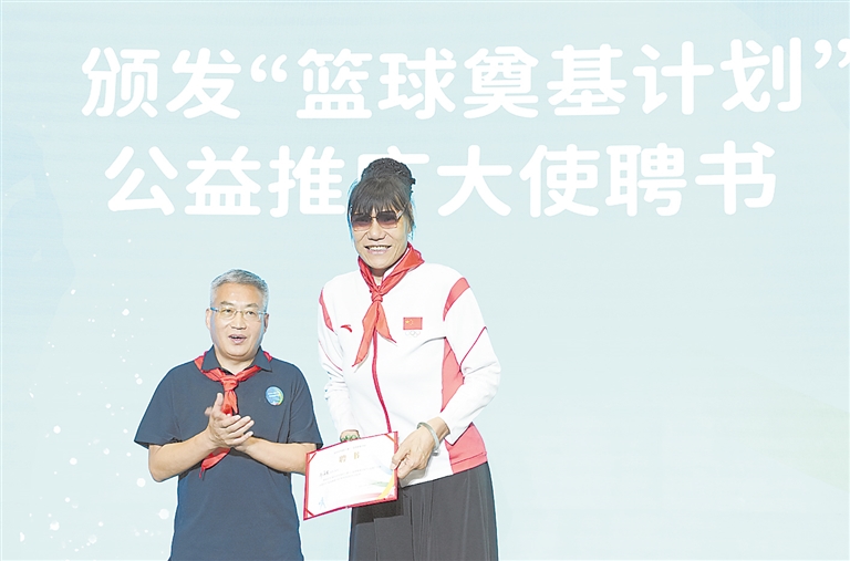 8月13日,中国女篮名宿郑海霞(右)获颁公益推广大使聘书。 当日,“新时代中国好儿童——篮球奠基计划”启动仪式在北京举行。 新华社记者 孟永民 摄