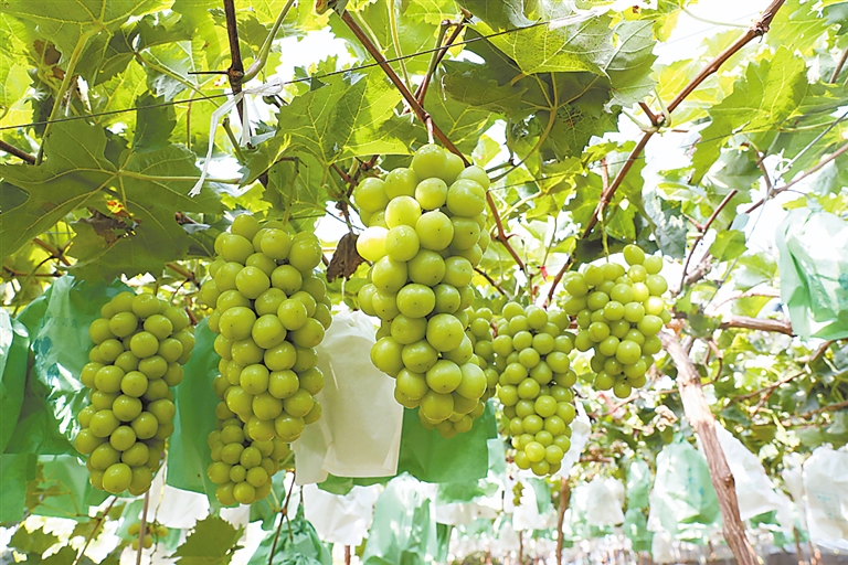 正是看中了它的市场前景,常大村从2019年便开始推广种植“阳光玫瑰”葡萄。该村实行“公司+基地+家庭农场+农户”运营模式,种植、管理和销售实现统一化、集约化、规范化、规模化;打造“数字果园”,应用智能温度控制系统、水肥一体化等智慧农业设施,有效提升葡萄品质。目前,常大村“阳光玫瑰”葡萄种植面积达230多亩。