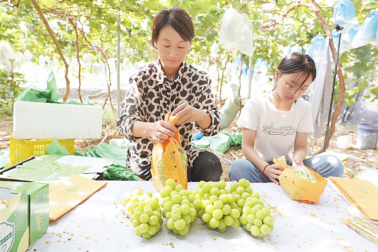 ▲挂满枝头的“阳光玫瑰”葡萄。 ◀种植户将“阳光玫瑰”葡萄进行打包。 顺平县委宣传部供图