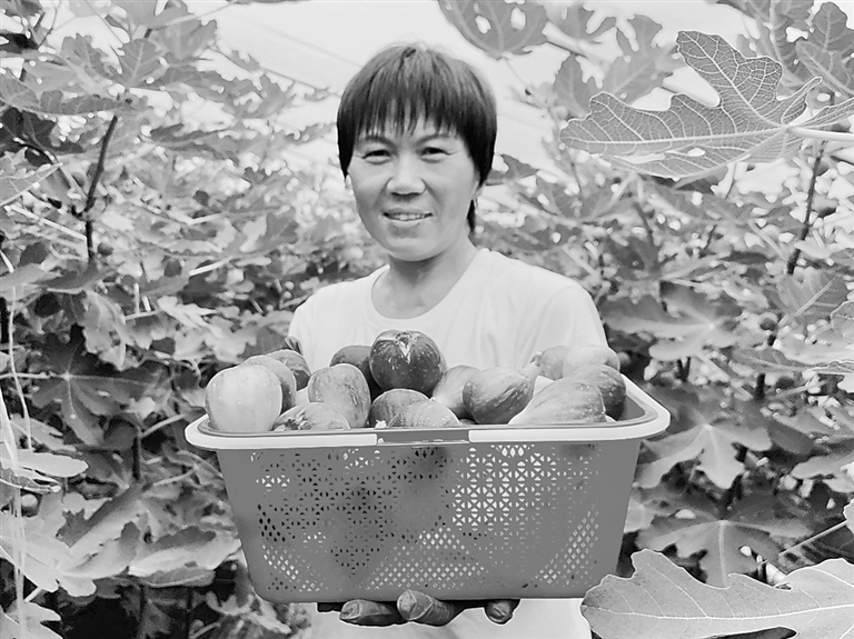 ▲家庭农场当家人张素华帮助游客采摘的无花果。 ◀无花果肉清香、甜糯、绵软,让人回味无穷。 ▼一排排无花果树青翠欲滴,挂满了果子。