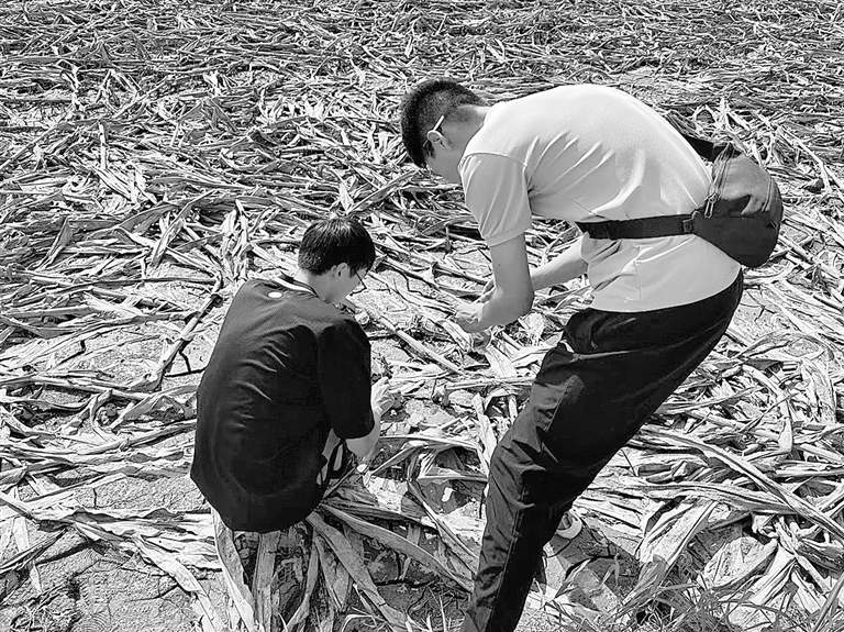 东城坊镇政府邀请中国农大专家到田地里检测土壤并采样。
