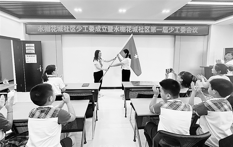 8月25日,竞秀区水榭花城社区少工委正式成立。来自复兴小学的少先队员们为出席人员佩戴红领巾,学校为社区颁发水榭花城社区少工委铜牌和校外辅导员聘书。在学校大力支持下,社区少工委今后将组织开展丰富多彩的实践活动,为少先队员课余时间增添活力,教育引导他们听党话、跟党走,开阔眼界、增长知识、全面发展。 秦月婷 摄