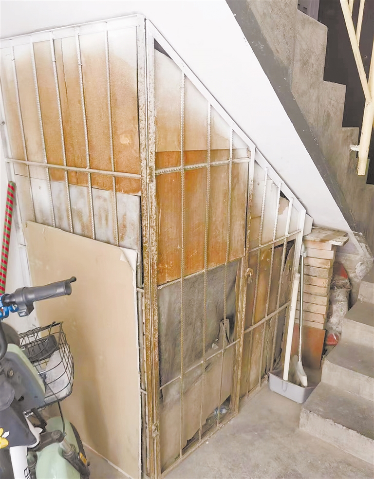 根据王先生反映的情况,记者来到位于双彩街附近的帅府小区实地探访。在该小区18号楼3单元一楼楼梯下,记者看到了一个由铁质栏杆围着的木质“简易房”,这个小房子是利用楼梯下方的空间搭建起来的,由于“简易房”上了锁,无法看到里面存放着什么。“里面都是杂物,像纸板之类的,很容易引起火灾。”刚下楼的陈阿姨忧心不已,“当事人为自己方便,将楼梯间进行了改建,私自在楼梯间搭建‘小仓库’,不仅侵占了公共空间,而且容易产生异味,还存在火灾等安全隐患。”