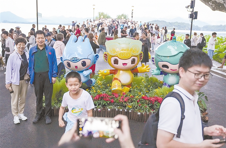 游客在西湖边与杭州亚运会吉祥物合影。