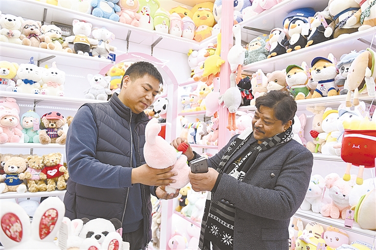来自印度的客商(右)在义乌国际商贸城的一家玩具店铺内选购商品。(资料图片)