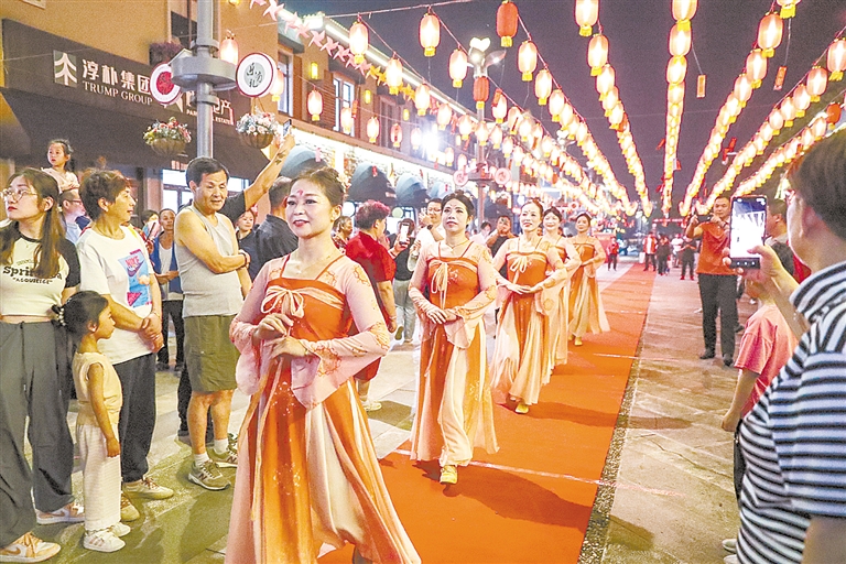 9月28日晚,湖州市长兴县煤山镇的村民和游客在逛庙会,看表演。 本版图片均由新华社发