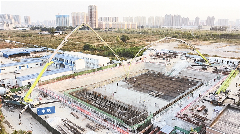 据了解,中铁四局三公司府河水系综合治理(一期)黄花沟综合治理工程治理范围西起长城北大街,东至京港澳高速,全长约21.753千米。施工内容包括河道疏浚、景观绿化、道路、污水管线、电气设备安装及智慧水务等工程。此次6号调蓄封顶历时16小时,浇筑方量1105方,调蓄池建成后容积9600立方米,有效水深8.8米,服务面积294公顷。