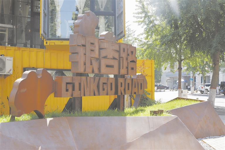 同时,为更好打造新颜值街区,从2022年5月份开始,高新区按照原绿地划分区域进行了形象提升改造,在街区入口的康泰街和银杏路交叉口,制作“银杏路”字样的巨型LOGO景观地标。在银杏路相关路段北侧绿化带,使用耐候钢板为主材,辅以旧城改造拆除的红砖等回收建筑材料,以现代构成设计理念制作绿化带及甬道,搭配使用砾石、火烧板、草皮等本地材料改造。