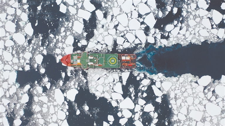 北京时间1月6日,执行中国第40次南极考察任务的“雪龙2”号在阿蒙森海为潜标布放开辟水道(无人机照片)。北京时间1月6日,中国第40次南极考察队在阿蒙森海成功布放深水生态潜标,这也是中国首次在极地布放生态潜标。 新华社发(陈栋彬 摄)