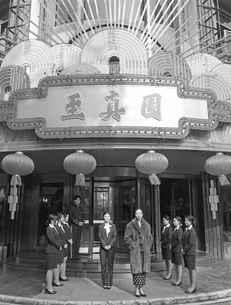 1月6日在上海影视乐园(车墩影视基地)拍摄的电视剧《繁花》中的至真园酒家。乐园复原了剧中的画面和场景,供游客们沉浸式“打卡”。