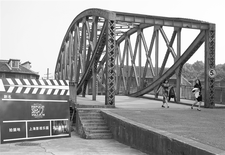 1月6日,在上海影视乐园(车墩影视基地)的浙江路钢桥实景旁,放置着电视剧《繁花》在此拍摄的标志牌。