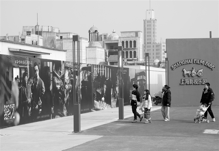 1月6日,在上海影视乐园(车墩影视基地),游客被《繁花》的海报吸引,电视剧是在此基地的实景中拍摄。