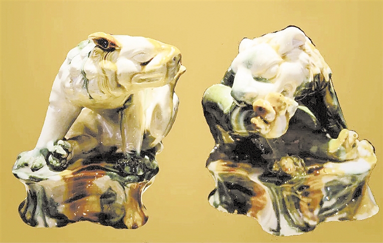 陕西省西安市临潼博物馆收藏的这对唐三彩狮子高18厘米,蹲卧状,造型优美,栩栩如生,俏皮活泼,逗人喜爱。一只安然自得俯首啃蹄,一只闭目凝神抬蹄搔痒,看起来非常顽皮。唐三彩造型中三彩狮稀少,这对三彩狮子是迄今所见制作时代最早、艺术水平最高的三彩动物造型,它的问世一扫唐代帝王陵前石狮四蹄抓地的呆板作风,也是我国目前出土最完整的一对三彩狮子。