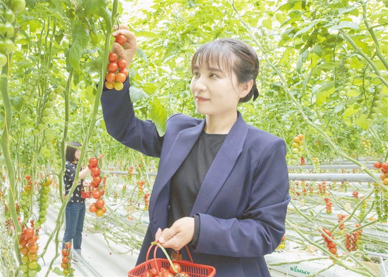 在生产区,一串串红色、黄色、紫色的小番茄圆润饱满、俏丽喜人,工作人员正忙着采收。“这种紫色的番茄叫紫色诱惑,市面上比较少见。它口感绵密,富含维生素和花青素,多吃有利于保养皮肤和降血脂。”园区讲解员说,这里的番茄每年9月定植,12月进入收获期,一直延续至第二年6月。