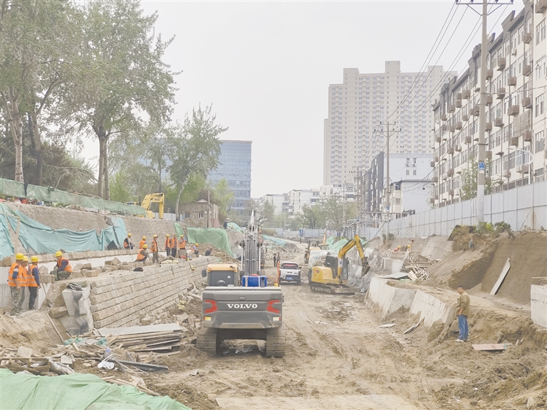 西护城河段,施工人员和施工车辆正在紧张有序施工。 郝子帅 摄