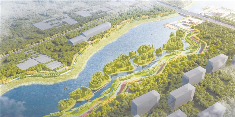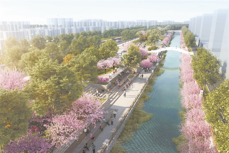 以府河为中心,环城水系二期整体贯彻以“水、绿、路”+“便民设施、休闲游憩”+文化场景的设计战略,以生态赋能城市,激发区域活力,从原来的背水而建转向未来的面水而兴。