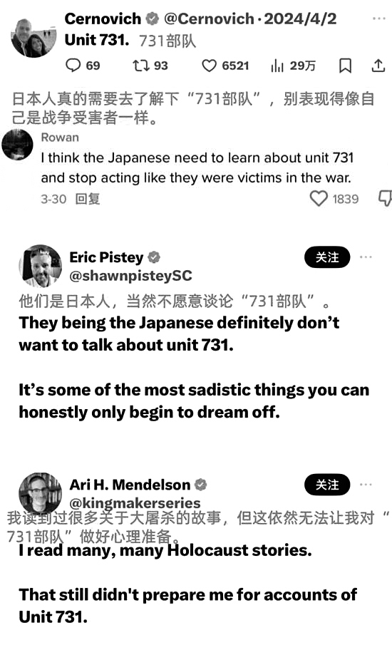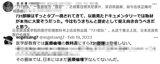 有日本网友表示,“731部队”一直被视为“禁忌”,相关纪录片的采访也很难。“日本就连医学院的医疗伦理教科书上也没有出现‘731部队’。从这个意义上说,日本还没有医疗伦理学。”一名日本医生说。
