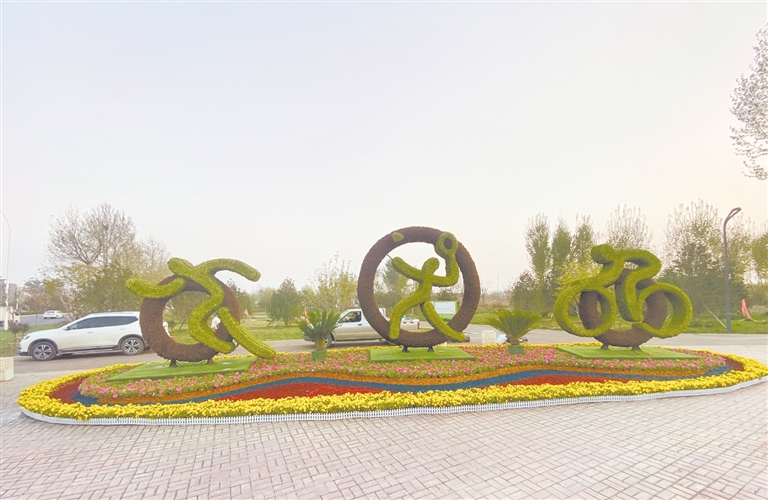东风路与东三环交口东、西两侧,曾在去年马拉松赛上出现过的运动元素绿雕,又再次复活复壮,结合园林废弃物,以花坛形式进行装点,呈现一片充满生机活力的景象。