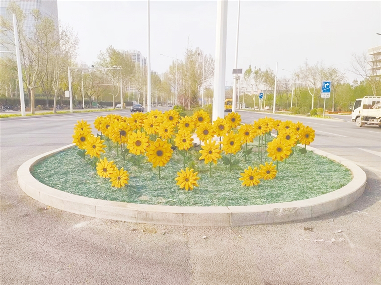 朝阳南大街与南堤路交口分车绿化带内,废旧木桩、木板、金属骨架拼接成的彩色奔跑人物雕塑寓意勇往直前、奔向未来,小型向日葵花海表达了热情和希望的主题,鼓励人们保持乐观和充满希望。