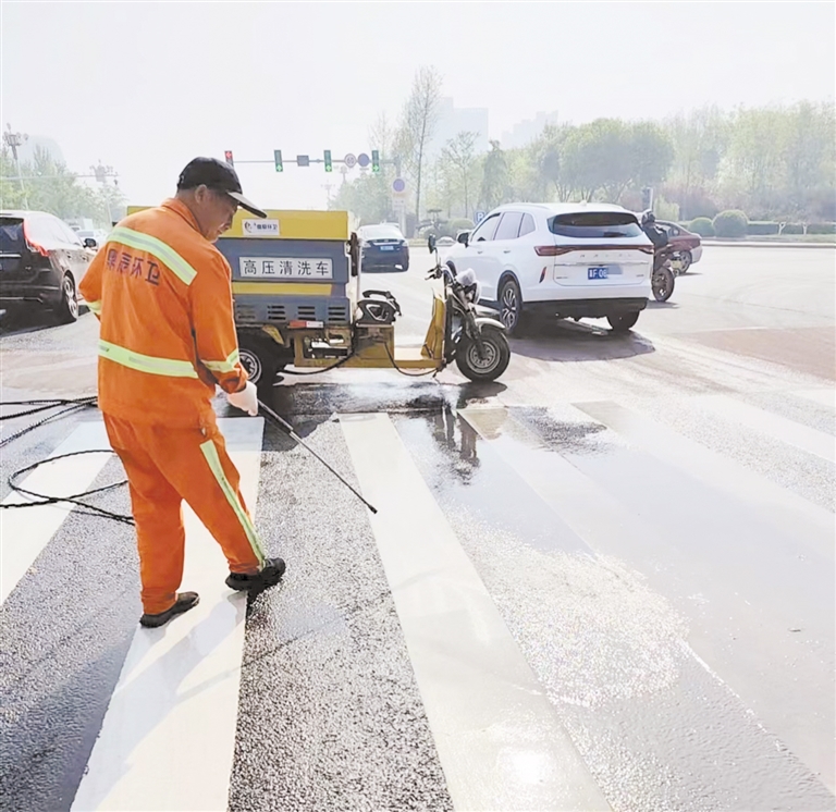 针对平时不易被冲洗区域,环卫作业单位安排高压养护车和洗扫车进行细致循环冲洗。