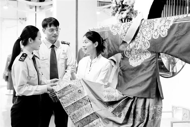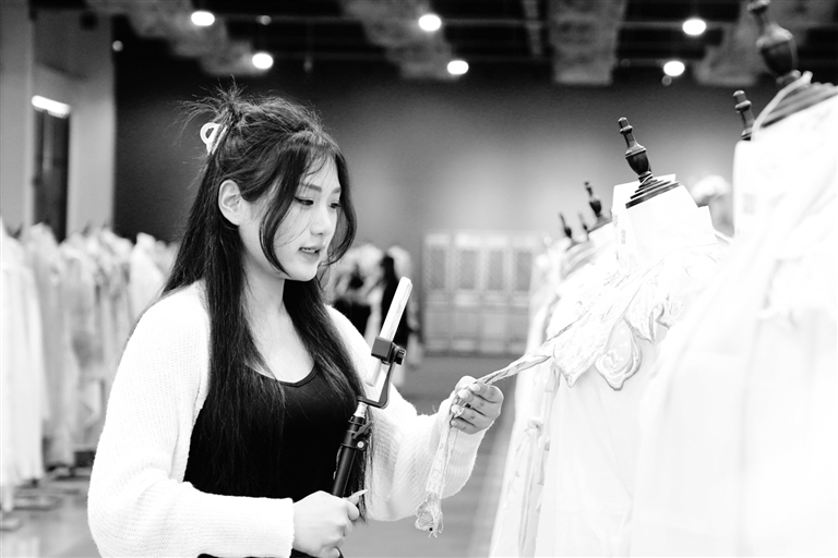 “85后”的黄晓燕曾在南方打拼十余年,如今成为曹县穿越大唐汉服云仓经理。“虽然是在乡镇工作,但贴近市场,节奏非常快,每天顾客络绎不绝。”她在展厅里边走边介绍,公司自主设计的汉服涵盖唐、宋、明、清等品类,并根据人们日常着装特点加以改良。在这里,不仅能够私人订制服装,还有AI直播改善线上消费体验。