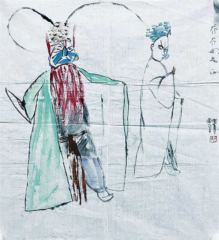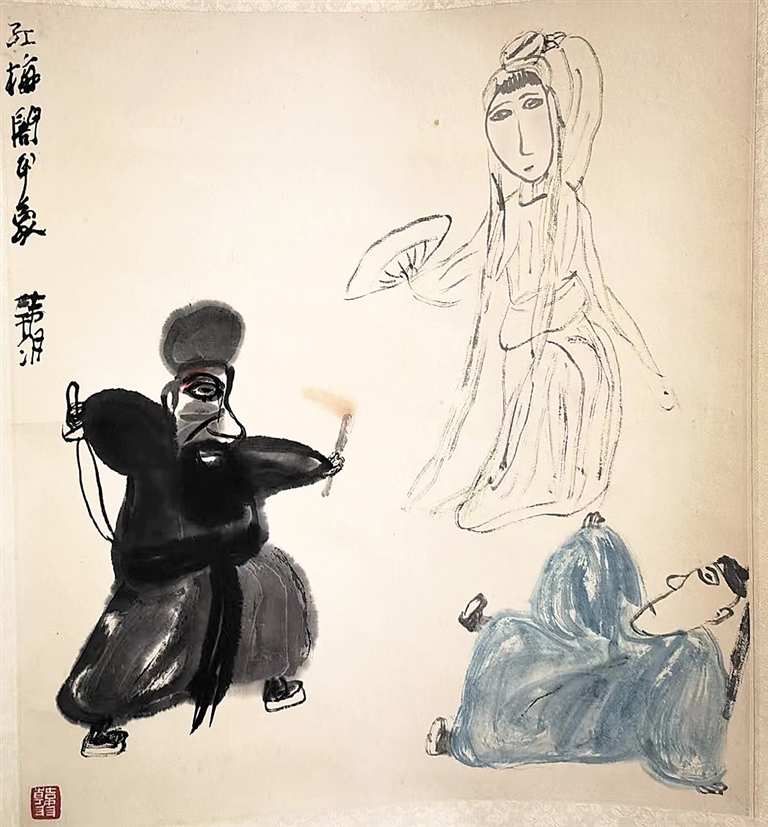 近得韩羽先生一张水墨写意戏画。众所周知,当代写意戏画有三驾马车:番禺关良、金陵马得(高马得)、庄里韩羽。我个人的体会是:关画重在描摹情节,高画胜于表达情态,而韩画则侧重探求意象,即用水墨这一工具探索未知的美,而这美也正是在尺度的精准把握中产生。