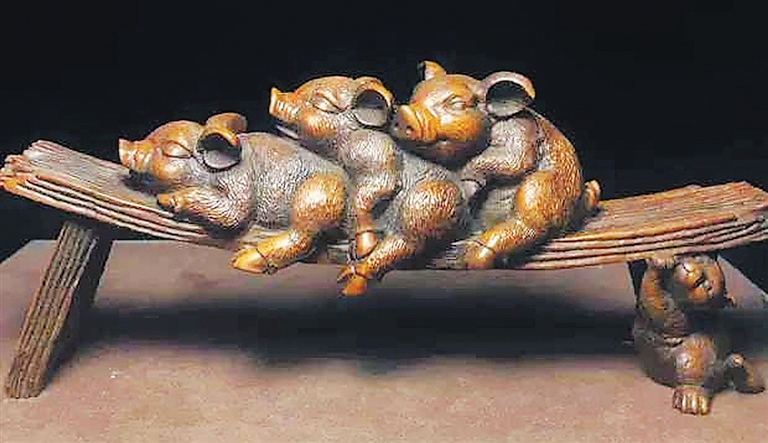 “小池聊养鹤,闲田且牧猪。”闲暇时,吟颂着有关猪的古诗,观赏这个萌萌的板凳猪摆件,闻着黄杨木淡雅芬芳的香气,惬意极了。