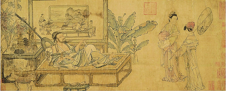 卧榻上面的主人公一身燕居之服,右手轻拈拂尘,左手漫拄书卷,背倚隐囊,一双方鞋脱在踏床,隐囊后面竖一把阮咸。画面右方有侍女二人,一人捧袱,一人肩扇。卧榻后面是一架座屏,芭蕉、翠竹分别点缀于屏风两侧,屏面又嵌了一幅画。