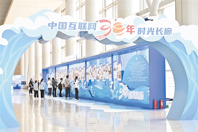 7月9日,与会者在大会展览展示区设置的中国互联网30年时光长廊内参观。 当日,由中国互联网协会主办的2024中国互联网大会在京开幕,大会以“互联三十载 智汇新质变”为主题,聚焦人工智能、工业互联网、数据要素、算力、数字政府、智慧教育、数据安全等热点,大会将持续至11日闭幕。 新华社记者 李鑫 摄
