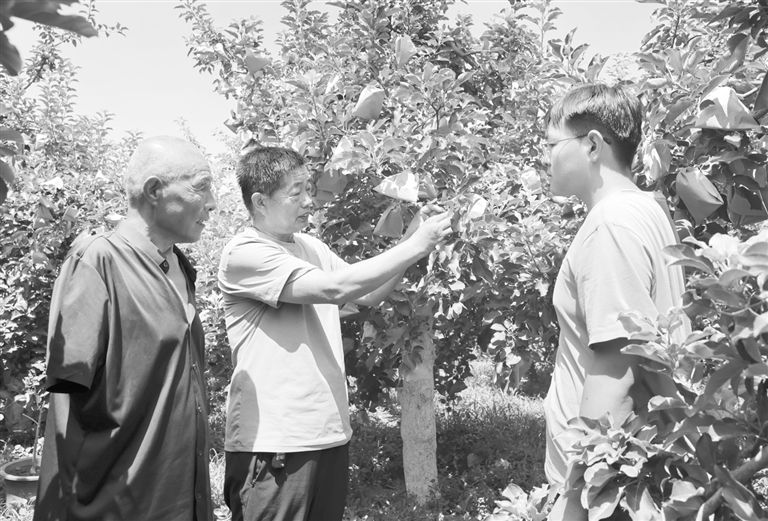 顺平县林果技术推广站站长张宪成(中)向张联合(左)父子传授夏季果树管理经验。