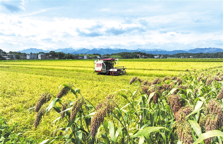 7月13日,在湖南省常宁市胜桥镇尹桥村,农民驾驶农机在收割早稻(无人机照片)。 时下,多地早稻陆续成熟,当地农民抢收早稻、翻耕稻田、抢插晚稻。 新华社发(周秀鱼春 摄)