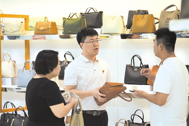 白沟新城和商道市场服务有限公司党支部深入到箱包交易城了解商户诉求。 孙珞瑜 摄