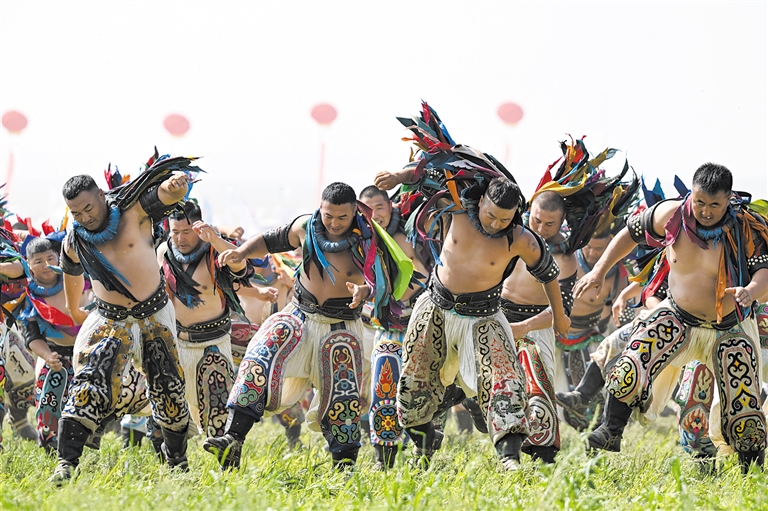 7月14日,搏克手在开幕式上表演。7月14日,“相约草原·遇见那达慕”内蒙古第34届草原那达慕在锡林郭勒盟开幕。本届那达慕开幕式由“相约草原”“亮丽北疆”“守望相助”三部分组成,乐器、歌舞等演出精彩纷呈,吸引游客前来感受草原文化。 新华社记者 贝赫 摄