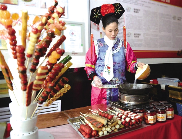 糖葫芦是专属于冬日的情趣,晶莹剔透的山楂被竹签串在一起,在阳光照耀下,红彤彤地闪光。 将串好的山楂均匀滚一遍糖浆,锅底倾斜一点,入锅、旋转都要快,糖壳薄而均匀,不硬也不粘牙。 纯山楂糖葫芦脆甜酸爽,果味芬芳,又创新了红豆沙、绿豆沙和豌豆沙,里面都粘着果脯与核桃仁,还有不少人都喜欢的麻山药,香甜和软糯令人无法抗拒。