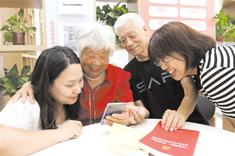穆庆元和乔增苓同社区工作人员分享自己的快乐生活。 保定新闻传媒中心记者 翟志刚 摄