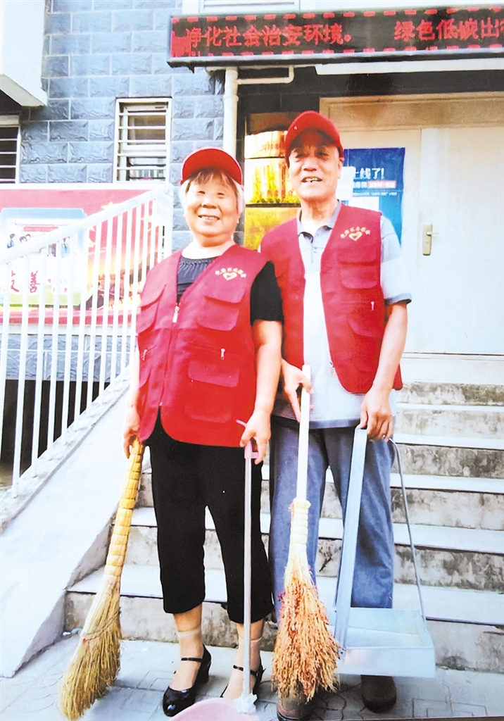 老两口一起参加社区义务劳动时的合影。