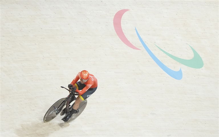 8月29日,李樟煜在比赛中。 当日,在巴黎残奥会场地自行车男子C1级3000米个人追逐赛中,李樟煜赢得本届残奥会中国体育代表团首枚金牌。 新华社记者 贺灿铃 摄