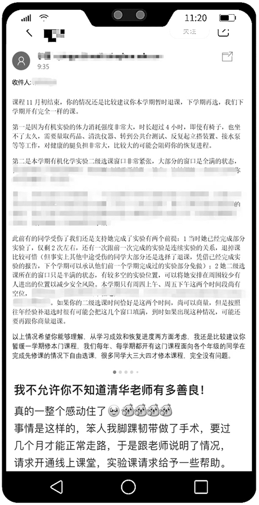 特别是他向有机化学实验课程老师于莹通过邮件说明情况,请求在实验课上给予帮助。于老师回复的邮件中,为胡同学详细分析了上这门实验课将要遇到的困难、面临的问题以及问题的解决方案。最后建议胡同学,“暂缓一学期修本门课程,我们每年、每学期都开有这门课程,面向各个年级的同学,在完成先修课的情况下自由选课。”