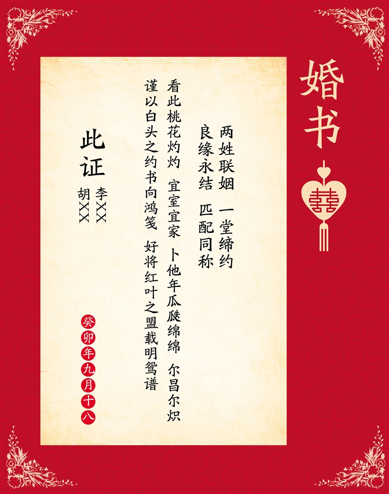 纸上婚书约白首,红叶之盟载鸳谱。