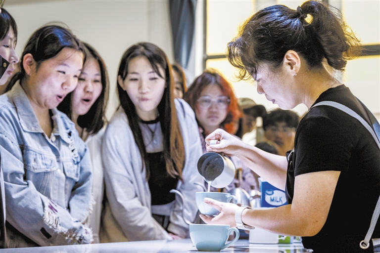 9月10日,云南农业大学热带作物学院教师黎丹妮(右)在咖啡认知课上给学生讲解咖啡拉花技巧。 近年来,我国咖啡产业蓬勃发展。为培养咖啡领域的高素质专业技术人才,云南农业大学今年设立全国首个“咖啡科学与工程”本科专业,来自11个省、市、自治区的首批咖啡本科学生在位于云南普洱的云南农业大学热带作物学院开启了大学新生活。 新华社记者 胡超 摄