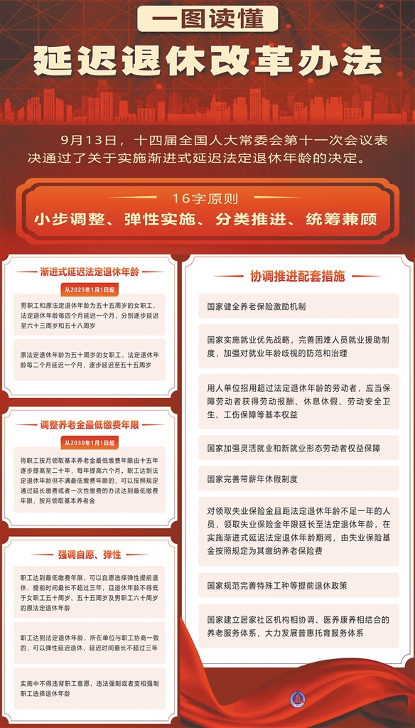 9月13日,全国人大常委会会议表决通过了关于实施渐进式延迟法定退休年龄的决定。根据决定,从2025年1月1日起,我国将用15年时间,逐步将男职工的法定退休年龄从原60周岁延迟到63周岁,将女职工的法定退休年龄从原50周岁、55周岁,分别延迟到55周岁、58周岁。 新华社发
