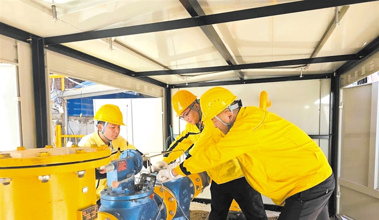 新奥燃气有限公司的设备维护团队对调压柜进行维护保养工作。