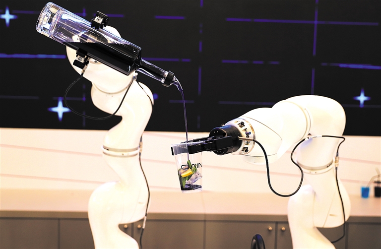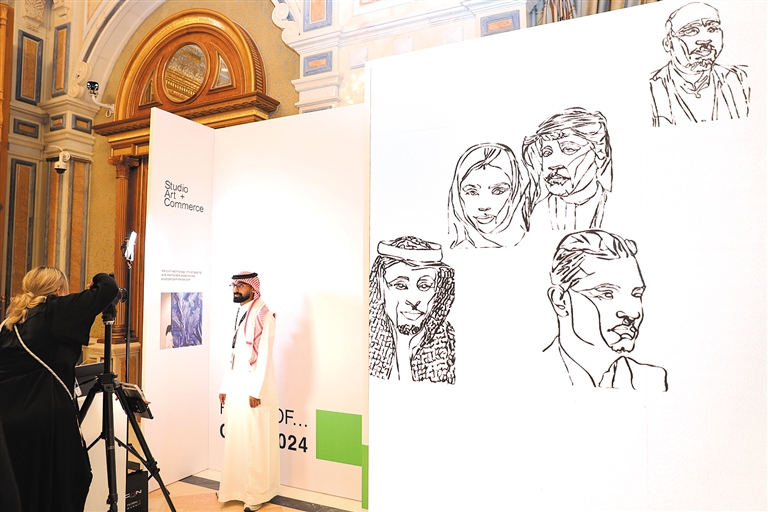 9月10日,在沙特阿拉伯首都利雅得举行的第三届全球人工智能峰会上,参会者体验人工智能绘画(图1)。机械臂为人们制作饮品(图2)。 新华社记者 王东震 摄