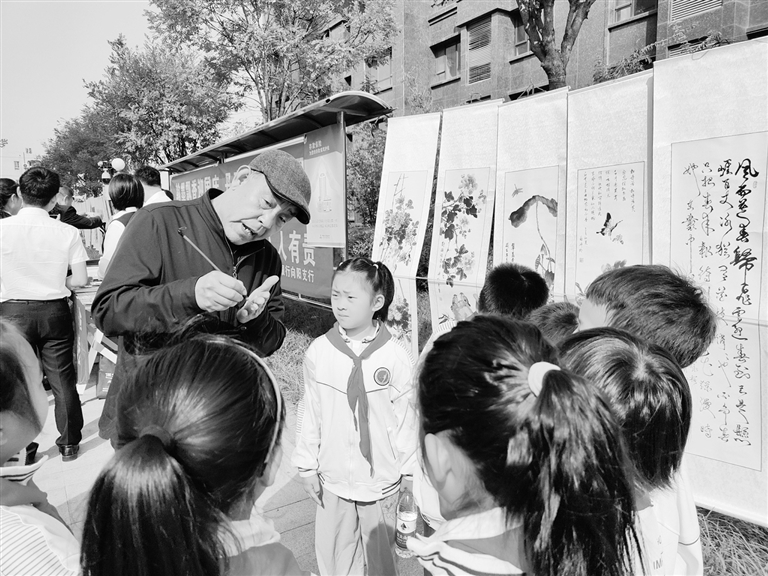 9月25日,竞秀区时代新村社区联合保定银行向阳支行,邀请保定市筑养乐书画研究会共同举办“翰墨飘香迎国庆 丹青溢彩颂党恩”书画创作展览活动。此次活动共展出字画80余幅,现场创作作品30余幅,为群众献上一场双向奔赴的文化盛宴,推进新时代文明实践工作走深走实。图为保定文化名家工作室傅保世老师向实验小学的孩子们传授书法知识。 梁宇晴 摄